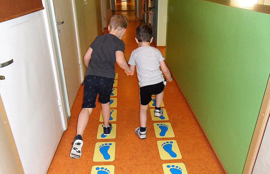 Teine idee oli luua lastele pรตnevaid liikumisvรตimalusi maja lรคbivas pikas esikus. Tervisenรตukogu liikmetega tehti kavandid, kujunduse mรตtles vรคlja Kapi Kass Oร ning tรถรถ teostas Candille Oร. Nii tekkis lastele vรตimalus kรตndida mรถรถda sirgeid vรตi siksakjooni, hรผpelda jalajรคlgedes ning mรคngida keksu. Kรตiki mรคrgistusi on maha pandud kaks, et need ei segaks rรผhmaga liikumist.