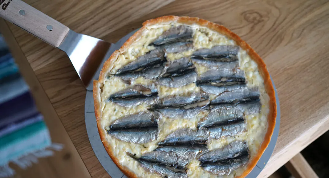 Tee nii: Mรตรตda jahu kaussi, lisa riivjuust ja tรผkeldatud kรผlm vรตi ning haki puruseks seguks. Lisa vesi ja sega tainaks. Suru tainas 24 cm pirukavormi pรตhja ja รครคrtele ning pane 15 minutiks kรผlmkappi. Pane ahi 200 kraadi peale sooja. Sega kodujuustu hulka muna ja riivitud parmesan. Lisa purustatud kรผรผslauk ja okste kรผljest lahti nopitud tรผรผmianilehed. Vala tรคidis tainale. Tรตsta terved kilufileed tรคidisele ja puista peale nรตrutatud kapparid.