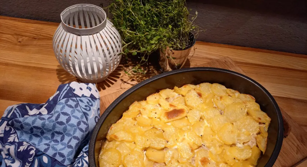 Tee nii: Koori ja viiluta kartulid ning keeda soolaga maitsestatud vees pehmeks, nõruta. Tõsta pooled kartulid võiga määritud väiksemasse ahjuvormi.
