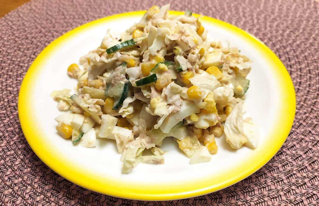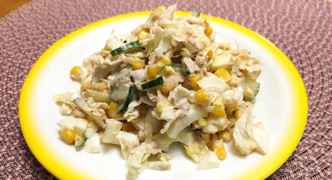 Vaja lรคheb: รผks suur kurk, 3 muna, umbes 100 g maisi, 1 tuunikala konserv (suurte tรผkkidega), veerand hiina kapsast, 2-3 spl hapukoort vรตi majoneesi, 0,5 tl sinepit (soovi korral), maitseks pipart ja soola.