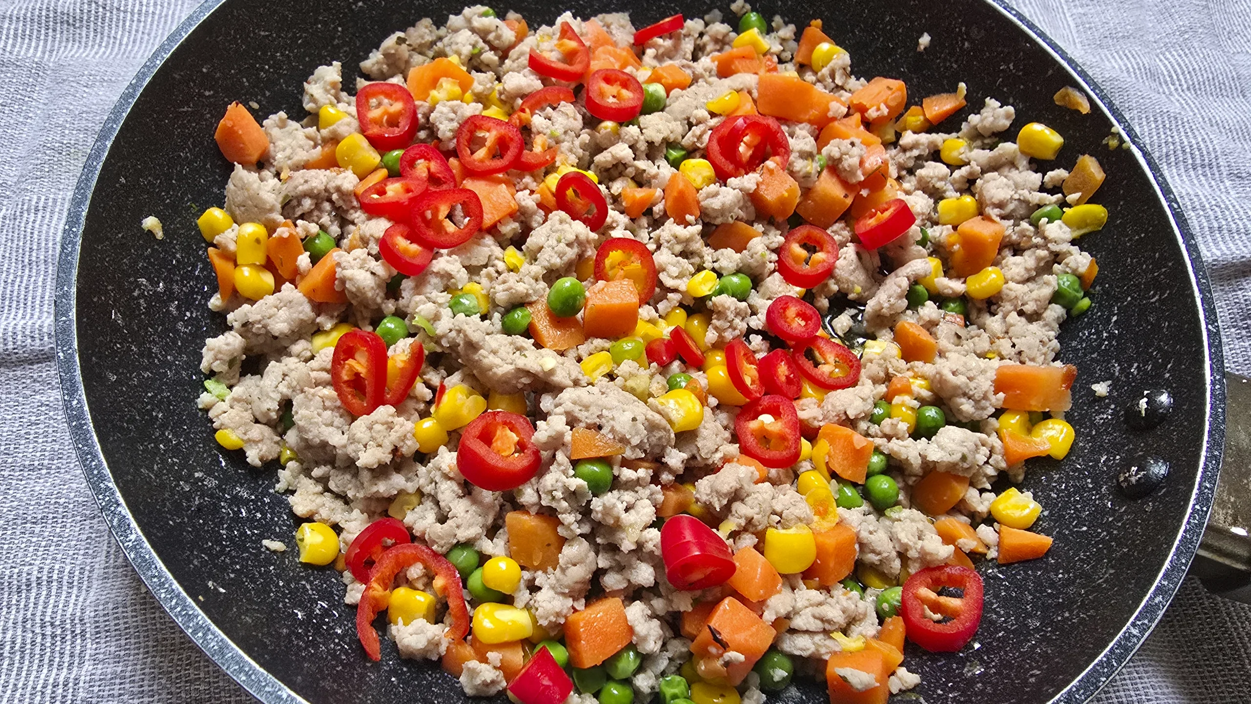Vaja läheb: Härmavilja segu (porgand, mais, hernes), 500 g hakkliha, 2 küüslauguküünt, riivjuustu, soola, pipart, ürdisegu, 1 tšillikaun, maitserohelist, oliivõli.